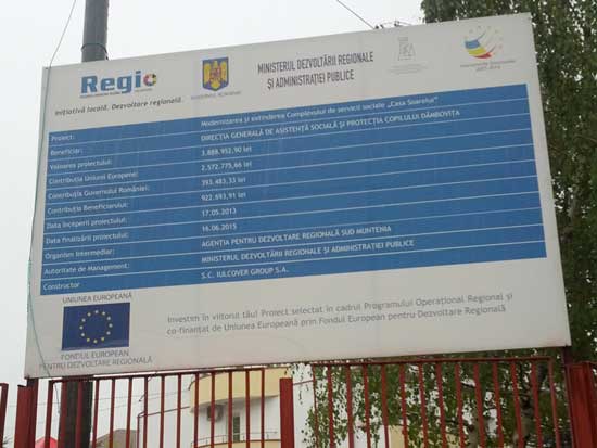 Acest proiect a beneficiat de finanțare din fonduri structurale și de sprijinul Consiliului Județean Dâmbovița, în cadrul Programului Operațional Regional (POR) 2007-2013, Axa prioritară: 3-„Îmbunătățirea infrastructurii sociale”, Domeniul major de intervenție: 3.2–„Reabilitarea/modernizarea/dezvoltarea și echiparea infrastructurii serviciilor sociale”, contractat de Direcția Generală de Asistență Socială și Protecția Copilului Dâmbovița.