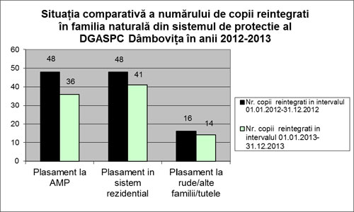 - S-a urmărit reducerea numărului de copii cu măsură de protecţie specială prin creşterea numărului de reintegrăridin sistemul de protecţie al copilului, prin susţinerea familiei naturale sau extinse în vederea accesării serviciilor sociale de la nivel comunitar, precum şi prin încurajarea şi sprijinirea adopţiei naţionale.