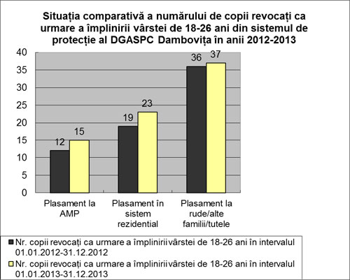 - Tot în aceeaşi perioadă 75 tineri au părăsit sistemul de protecţie la cerere, ca urmare a împlinirii vârstei de 18-26 ani, aceștia fiind integrați în comunitate (15 tineri din măsura de plasament la asistent maternal profesionist, 37 din măsura de plasament la rude/alte persoane şi 23 din măsura de plasament de tip rezidenţial, din care 6 tineri au fost reintegrati socio-profesional).