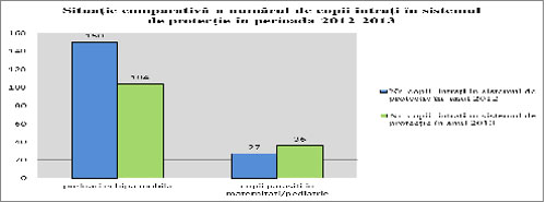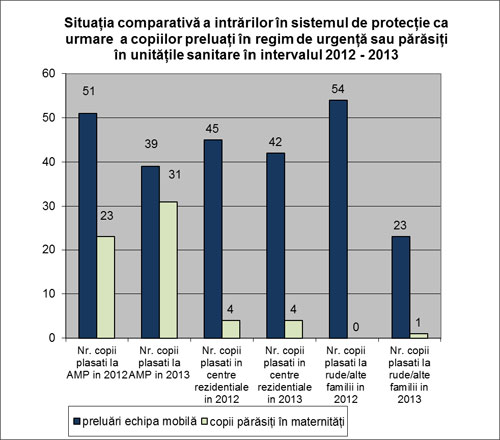 Se observă scăderea numărului copiilor intrați în sistemul de protecție specială și a mamelor minore monitorizate. Astfel, în anul 2013 au intrat în sistemul de protecție 140 copii (104 preluări echipa mobilă și 36 copii părăsiți în spital), față de anul 2012 când au fost preluați în regim de urgență 177 copii (150 preluări echipa mobilă și 27 copii părăsiți în spital).