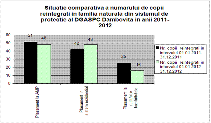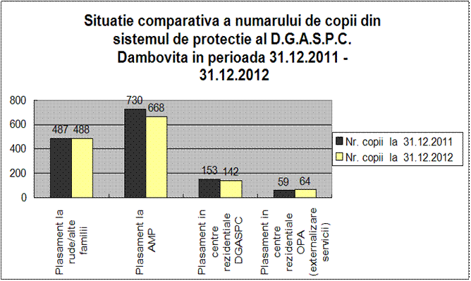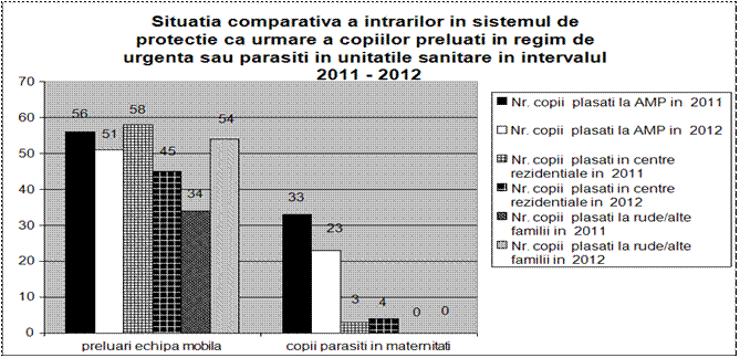 La începutul anului 2012, în sistemul de protecţie de tip rezidenţial pentru copii din subordinea DGASPC se aflau 153 beneficiari. în cursul anului au fost 48 reintegrări în familie, 19 tineri au părăsit sistemul ca urmare a împlinirii vârstei de 18-26 ani, 5 tineri au fost reintegraţi socio-profesional şi au fost 61 intrari noi în masura de protecţie de tip rezidenţial, astfel că la 31.12.2012 în sistemul de protecţie de tip rezidenţial existau 142 copii/tineri.
