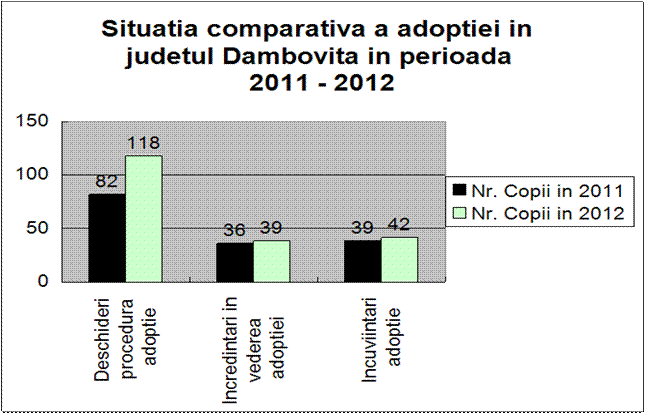 - S-a realizat deschiderea procedurii de adopţie naţională pentru 118 copii, 39 încredinţări în vederea adopţiei şi 42 încuviinţări de adopţie naţională. În anul 2012 au fost eliberate 35 atestate de familie/ persoană potenţial adoptatoare.
