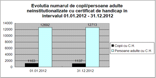 - În ceea ce priveşte evaluarea complexă a copilului cu handicap, au fost reevaluate şi evaluate în anul 2012 un număr de 1407 cazuri (168 cazuri noi). Dintre acestea, 817 s-au încadrat în gradul de handicap grav, 287 handicap accentuat, 278 handicap mediu şi 13 handicap uşor, iar 13 nu s-au încadrat.