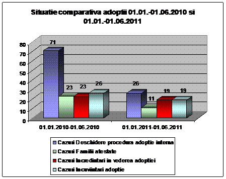 Comparativ cu aceeaşi perioada a anul 2010, indicatorii specifici activitatii serviciului Adoptii au inregistrat o scadere de ordin juridic si legislativ: schimbarea Completului de judecata la fiecare etapa a adoptiei, solicitarea suplinirii consimtamnatului parintilor la majoritatea sentintelor civile de deschidere a procedurii de adoptie interna fapt ce a determinat reluarea procedurii procedurii; dificultati intimpinate in instanta de judecata (termene la 2-3 luni de la data depunerii dosarelor, eliberarea sentintelor civile cu intarziere).