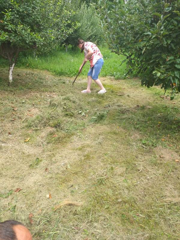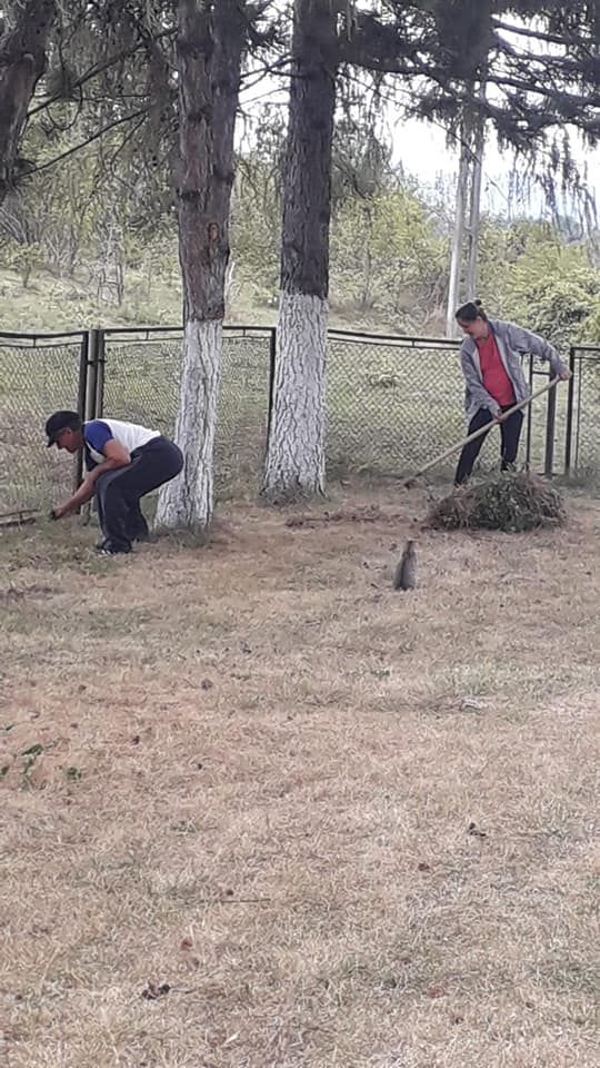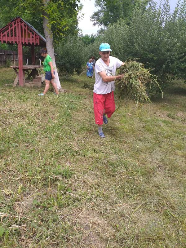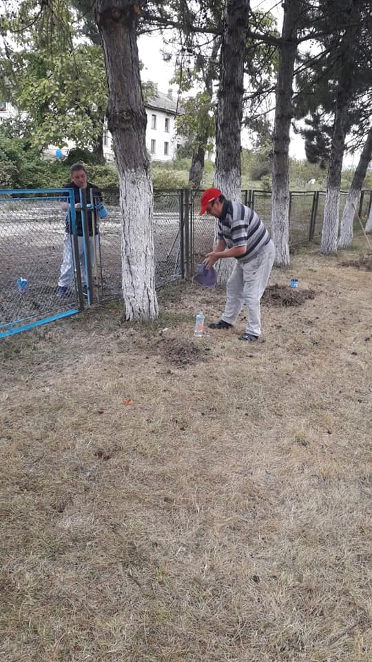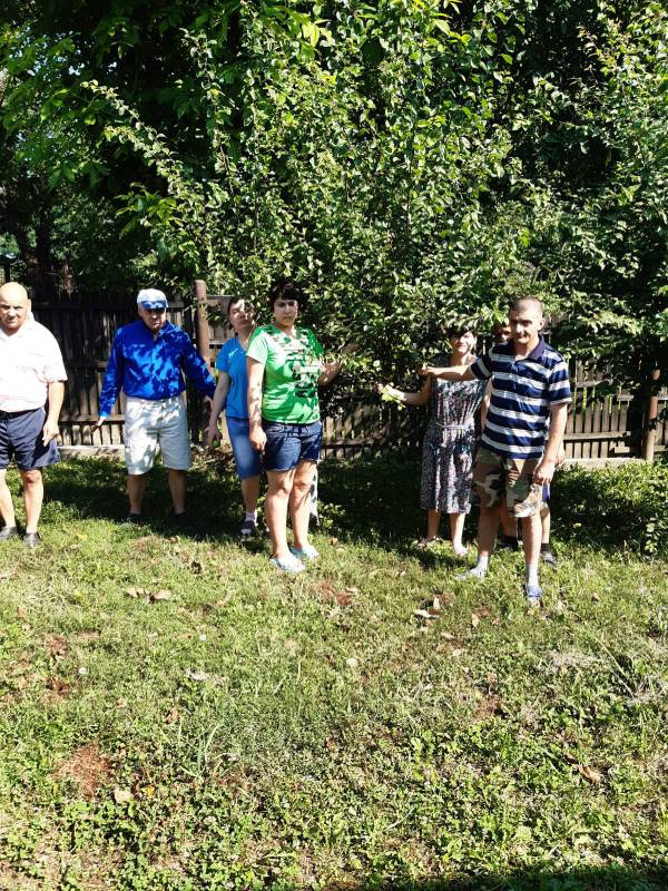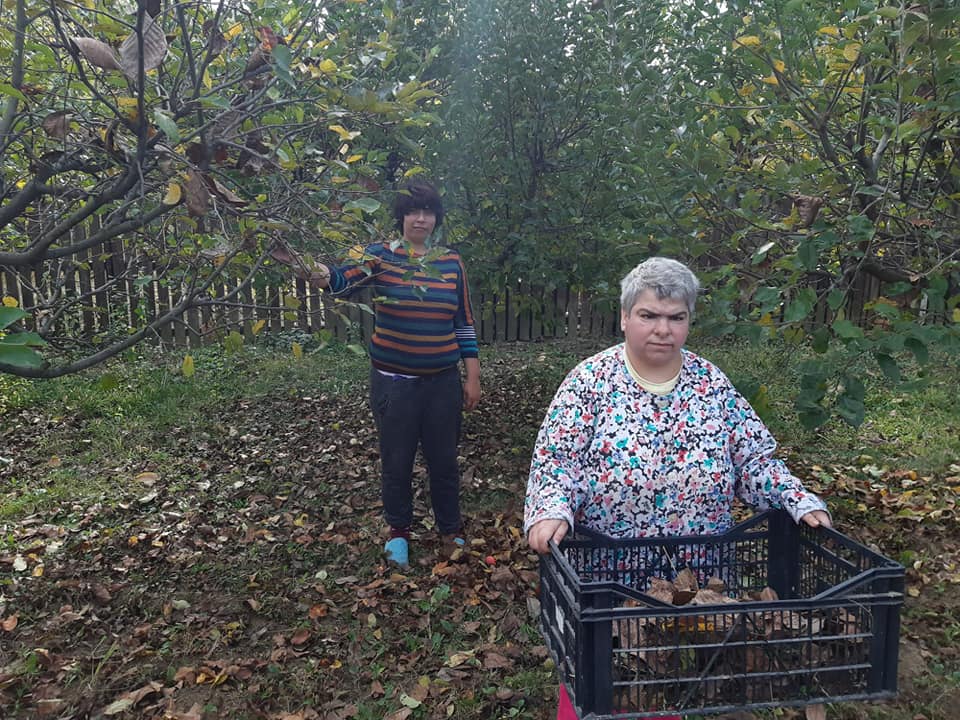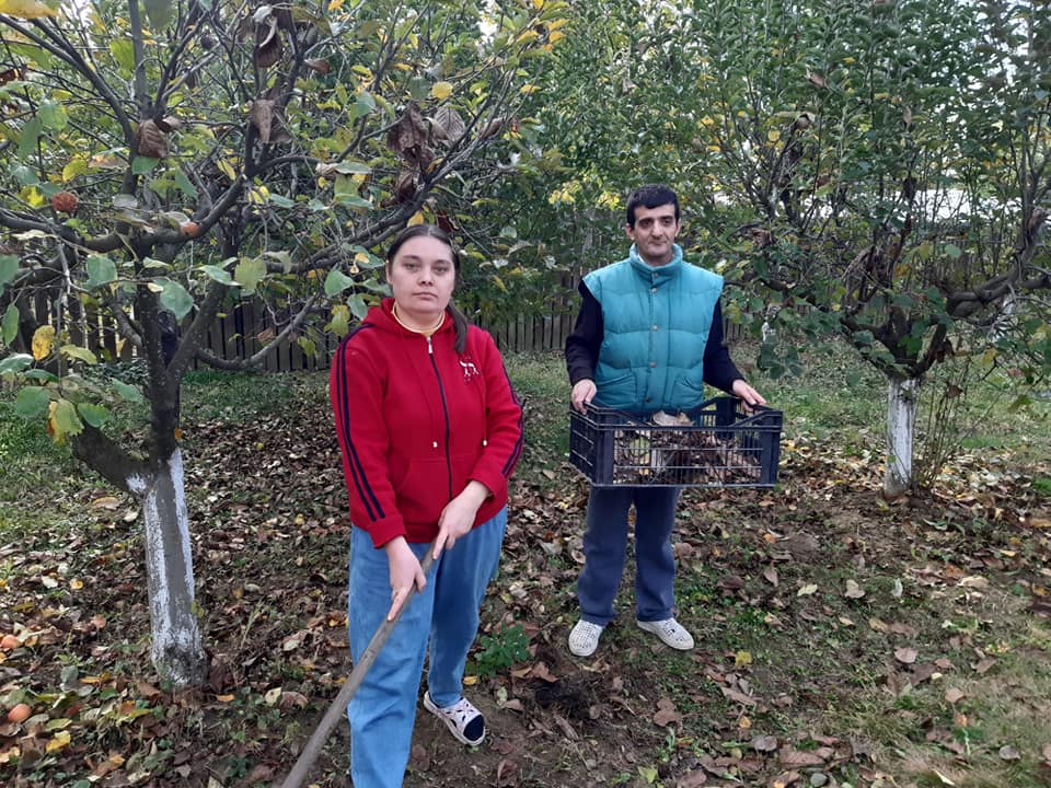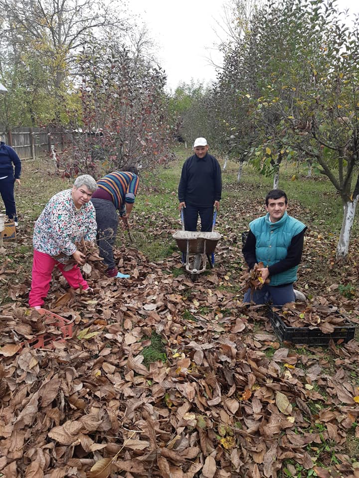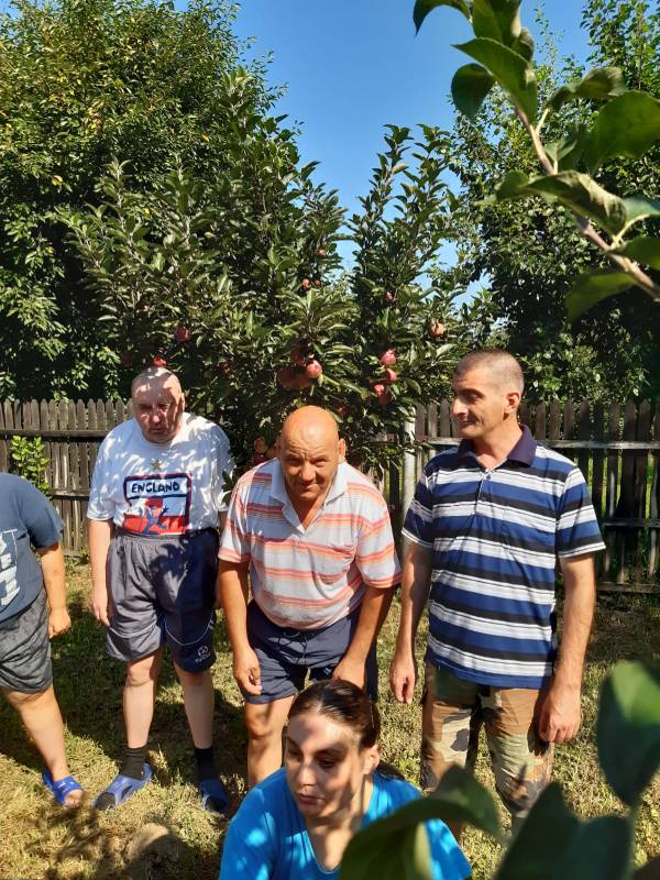 Beneficiarii Centrului de Servicii Comunitare "Sfântul Andrei” Gura Ocniței, sprijiniți de salariați, îngrijesc zilnic și cu mare drag frumoasa lor livadă de pomi fructiferi